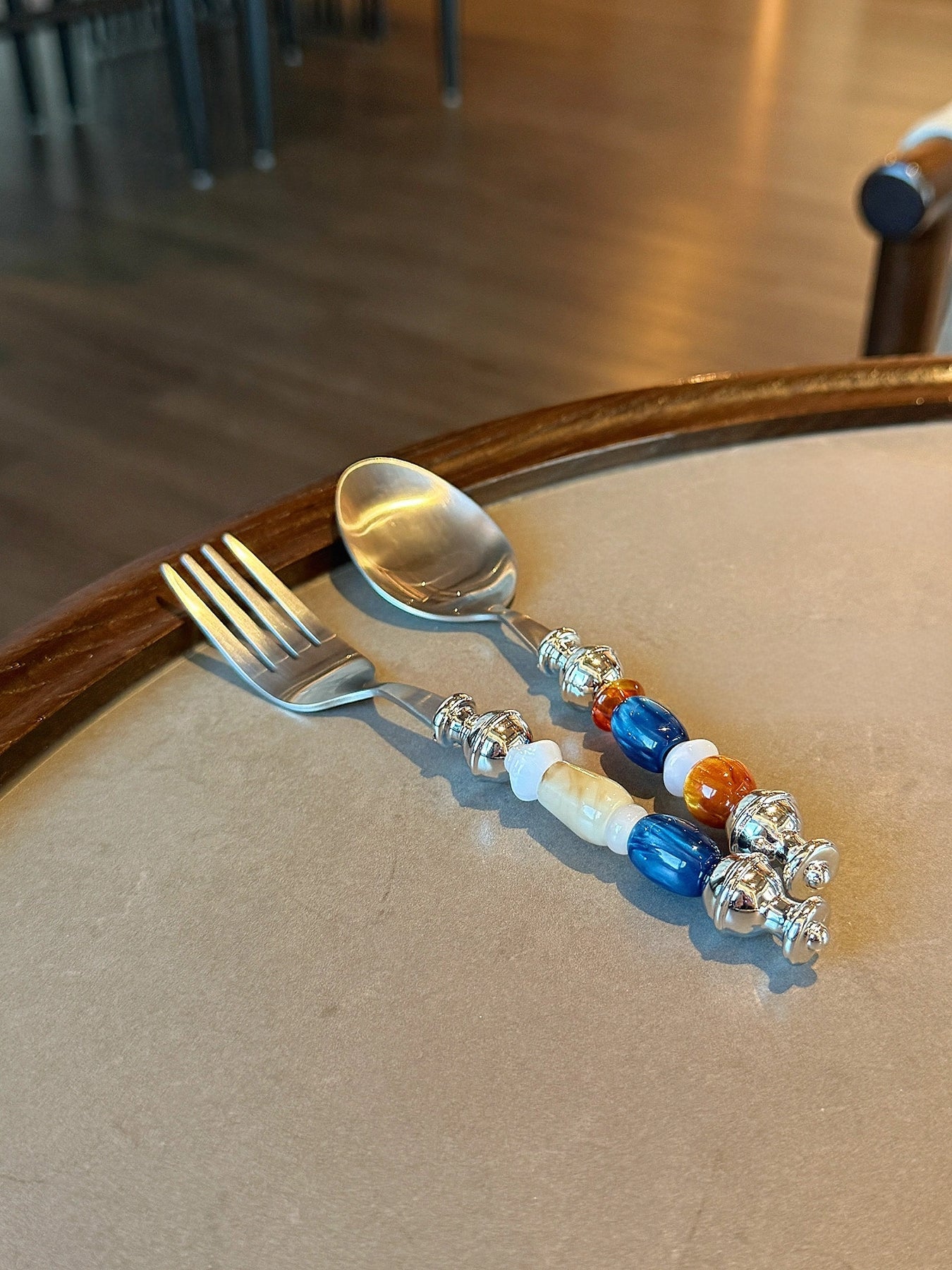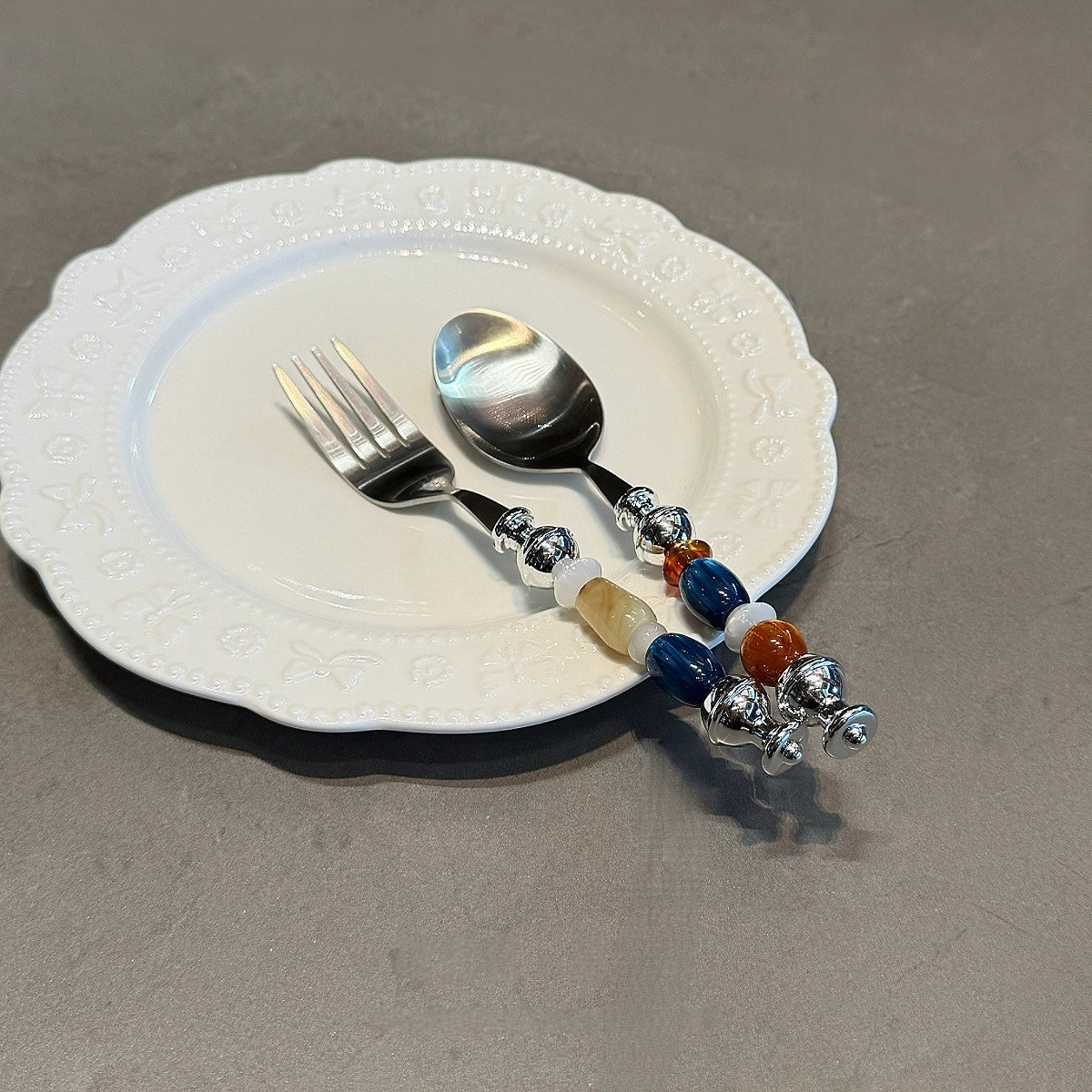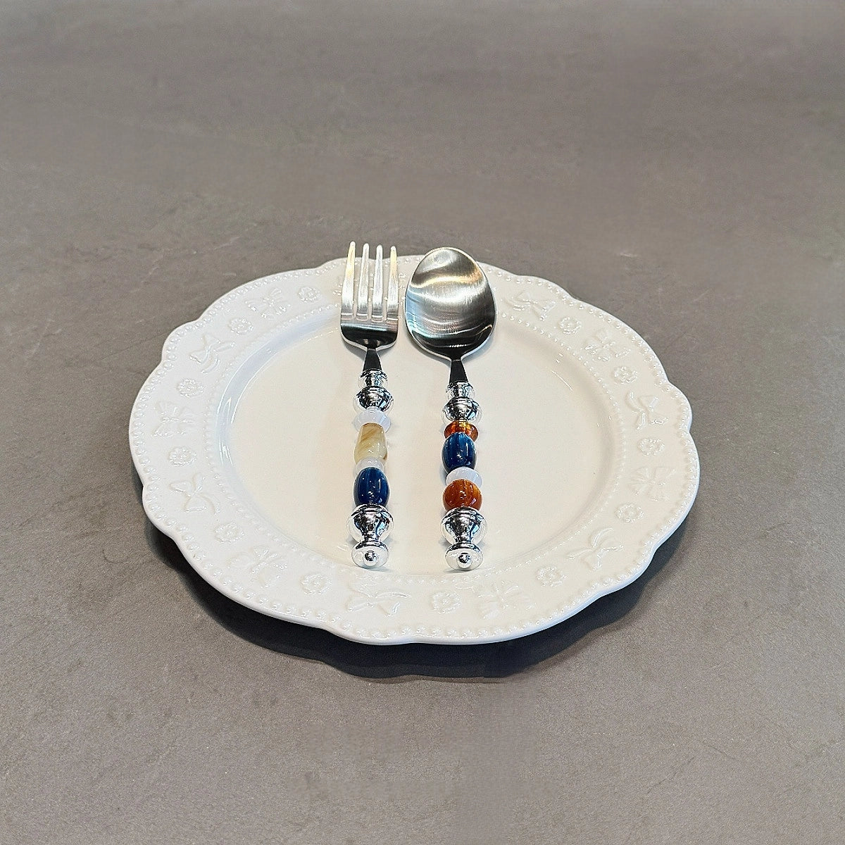 The handles of these stainless steel forks and spoons are thoughtfully strung with four beads of distinct character. Impressionistic deep blue spheres swirl with traces of white, like the churning of ocean waves under a midnight sky; amber-toned beads, warm and translucent, seem to preserve the glow of a thousand years of sunlight. Honey-hued orbs remain as clear as nectar, radiating a soft, rhythmic light as shadows drift across, while jade-like beads offer a dewy, porcelain-fine texture that feels as smooth as suet at the fingertips.