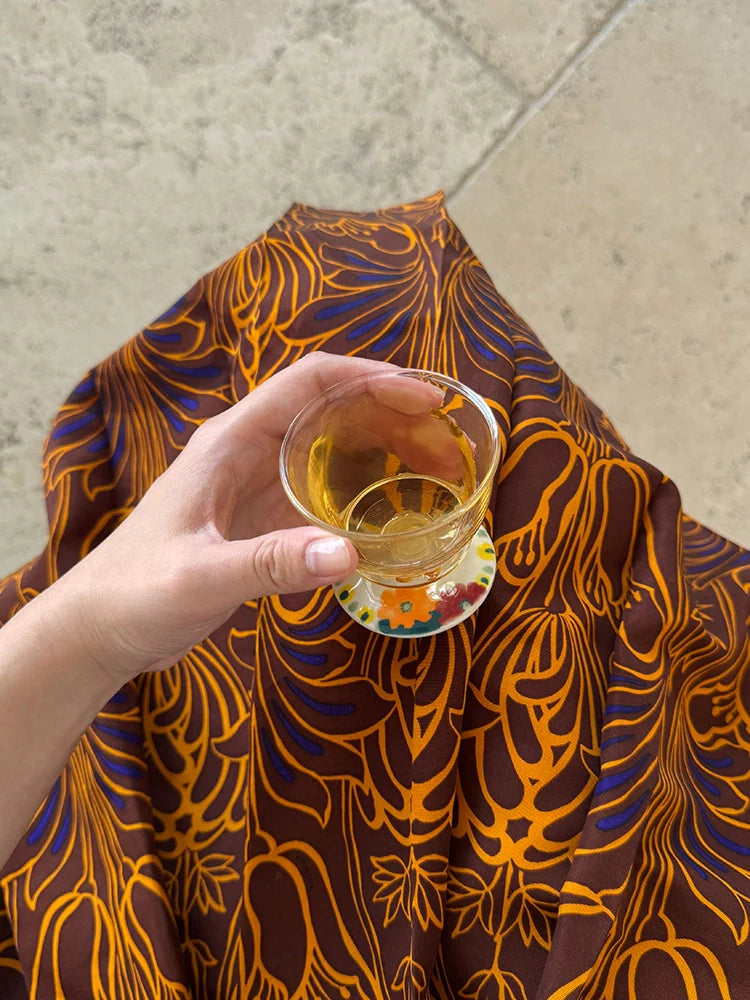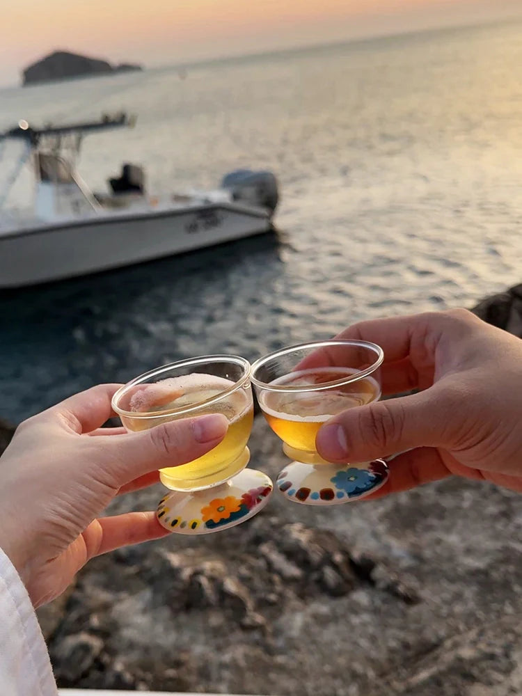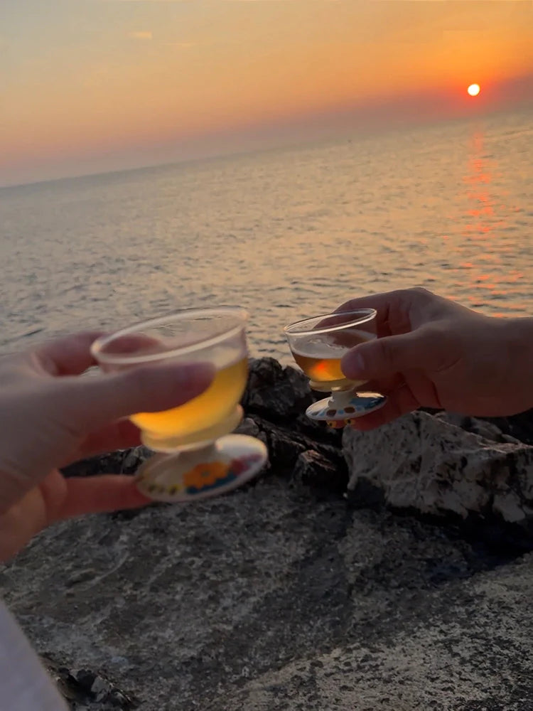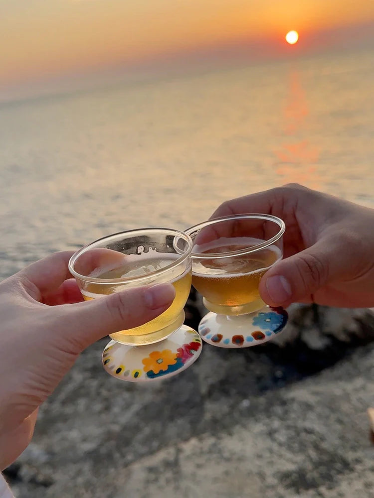 Delicate hand-painted flowers grow onto the transparent glass. The round and smooth small opening holds up a lively and chic exquisite sipping cup. Warm ceramic serves as the base, connecting with the clear glass to collide with a romantic, wonderful flavor. When the mellow taste flows in slowly, the flower dots at the bottom of the cup jump in the light and shadow, reflecting the secret of the flowers. Every toast is a tiny surprise; you are drinking not just tea or wine, but a little romantic daily routine. Slow down the rhythm, and let your eyes and taste buds get drunk together in the beauty of this moment.